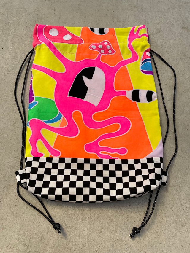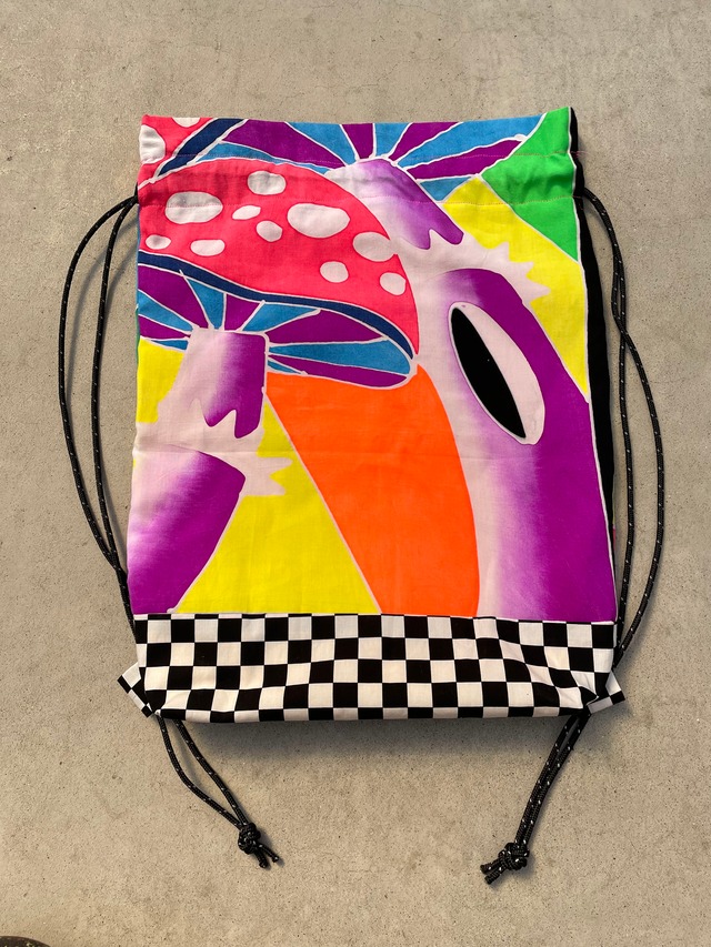 【商品説明】 ろうけつ染めと言う技法で一枚一枚手描きされた模様の布を使って作った、ハンドメイドのナップサックです。 サイズ…35㎝×50㎝ 素材 鞄本体…レーヨン/コットン 肩紐…ポリエステル 手軽に使えるナップサック/エコバッグです。 表側は薄手のレーヨン、内側と底部分にはコットンが重ねてあります。 パーティーやフェスでちょっとテントを離れる時、貴重品を持ち歩いたり、myディッシュmyカップを持参で飲食ブースや出店ブースにお買い物へ出かける時などにも便利です。 コンビニや銭湯へ…などなど、色々な場面で活躍します◎ 肩紐はアウトドア用の耐久性に優れた素材です、暗い場所で光りを反射します。 鞄本体はブラックライトが当たると柄が浮かび上がります。 ※お取り扱い注意点 尖ったものや固くするどい物を入れると破れる原因となりますので、ご注意下さい。