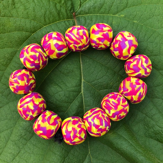 【商品説明】 ブレスレット 素材…premo(pvc/塩化ビニール、顔料)、ゴム パーツひとつひとつを手で捏ねて製作した、ブレスレットです。 発色が良く、ブラックライトに反応して光って見える、サイケなマーブル模様が目を惹きます。 どんぐり飴みたいなゴロッと大振りなパーツなので、インパクトがあり、シンプルなお洋服のワンポイントにもなります◎ たくさん着ければ派手力抜群です! 着脱は、ゴムなので簡単。 手首の太さ14〜15㎝の方むけ サイズが合えばユニセックスで使用して頂けます。 ※ 耐水性のある素材です、水や入浴可能な温度のお湯でしたら問題無く使用して頂けます。 アルコールには浸けないでください。 サウナなどの高温になる場所では外して下さい。 衝撃や圧力は破損の原因になります。