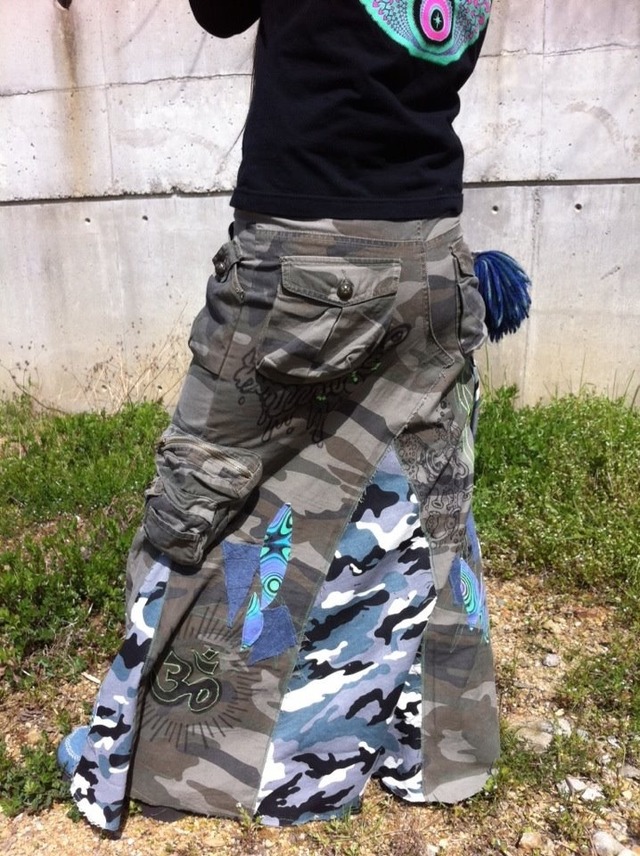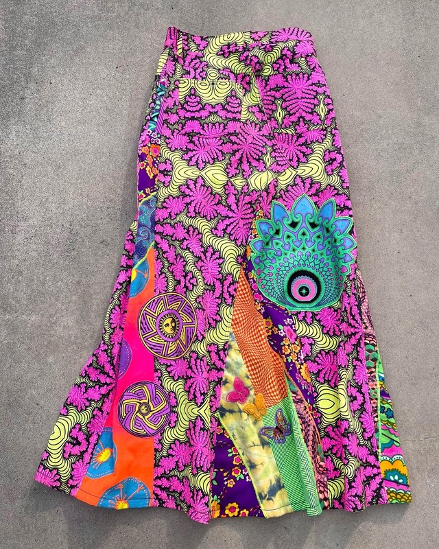 【商品説明】 パンツを解体して、パッチワーク生地を組み合わせてリメイクしたロングスカートです。 サイズ…レディースS〜M相当 ウエスト70〜73㎝ ヒップ85㎝ 着丈95㎝ 裾幅81㎝ 重さ…650g 素材…パンツ部分はコットン その他パッチワークの部分もほとんどコットンです。 本体はサイケデリックファッションのレジェンドSPACE TRIBEの現在では入手困難に激レアパンツを使用しています。 その他年代や入手先はさまざまですが、店主がコツコツと集めたコレクションとも言える生地やワッペンを大放出したパッチワーク生地を組み合わせました。『カラフル』や『派手』では表現しきれない総柄バッキバキの唯一無二の一点物です。 暗い場所でブラックライトに照らされて柄が光って浮かび上がります⭐︎ 写真10枚目に掲載してあります、裏地には切りっぱなしとなっている部分があるので、ホツレが生じます。ある程度使用やお洗濯を繰り返すとホツレは止まりますので、ゆっくりお付き合いください♡ 履けば履くほど味が出ること間違いなしです。 やや厚みがあります。 季節感は秋〜冬、春先くらいが最適だと思います。