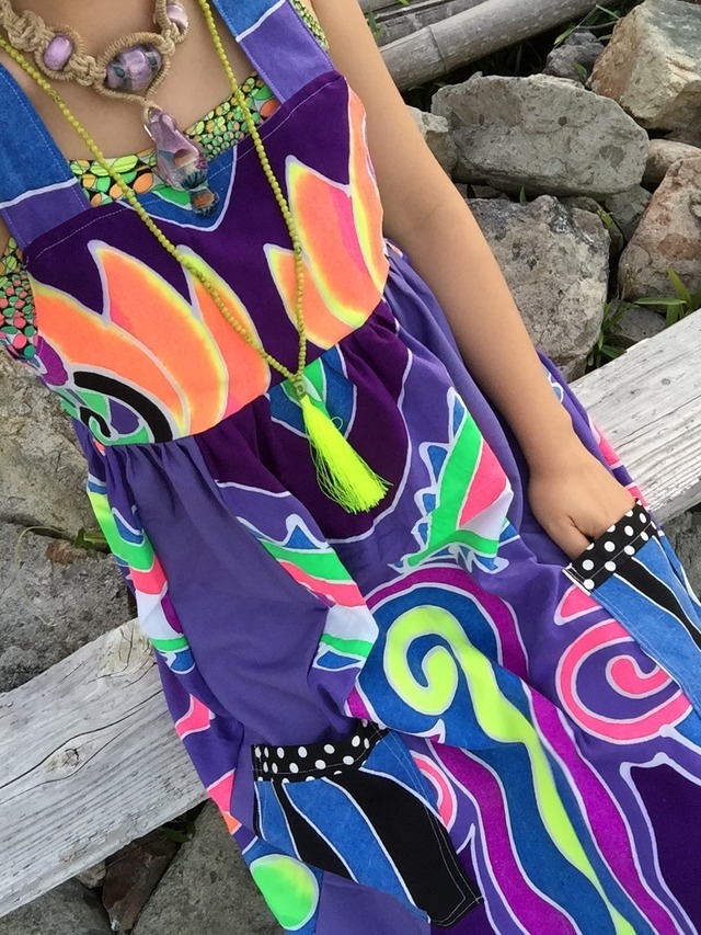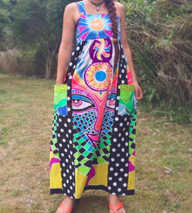 【商品説明】 ろうけつ染めと言う技法で一枚一枚手描きされた大きな柄の布を使用したハンドメイドのワンピースです。 生地の製作過程や保管状況などにより、初めから生地にやや汚れが有りました。目立ちにくいですが、写真でお確かめのうえご納得頂ける方のみ、お取引きよろしくお願いします。 素材…レーヨン(インドネシア製) サイズ…レディースM〜Lフリーサイズ 肩幅…切り替え無しのためフリー 身幅…56 ウエスト…60 着丈…130 大胆な絵柄や、蛍光色の色使いが特徴的です。 日中の太陽光のもとでは色鮮やかです。 夜や暗い場所でブラックライトで照らすと、柄が浮かびあがって幻想的な雰囲気です。 ウエストに巻いてシルエットをアレンジできるリボンベルト付きです。 70年代ヒッピーや、魔法使いのようなシルエットに、前後柄違いの全身総柄、フェスやレイヴなどのパーティーで着用すれば存在感抜群です。 ※お取り扱いポイント 薄くて乾きやすく、コンパクトに畳める素材です。シワになりやすいので、お洗濯後は物干しに袖を通して干したり、保管時には吊るすと、次回着用時に綺麗な状況で着用できると思います。 アイロン使用可能。 家庭用ミシンを使用して、手縫いの部分もあります。