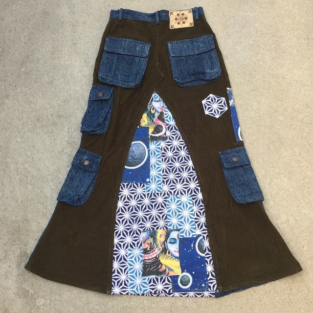 【商品説明】 送料込み デニムとコーデュロイ生地のパンツをスカートにリメイクしました。古着を利用したハンドメイド アイテムです。 麻柄とSHIVAと宇宙柄の生地をパッチワークしました。 ミシンで縫い進めていくリズムがまるでお経のように感じ、目から耳から…瞑想している気分になりながら製作したアイテムです! サイズ…レディースS〜Mの方向け ウエスト平置き36センチ ヒップ平置き45センチ 丈86センチくらい 程よい厚みの生地です、 季節的には秋〜冬〜春先まで着用して頂けると思います。 家庭用のミシンで気ままに製作したものです、 歪みや糸の始末など不完全なところもあると思います、ご納得頂ける方のみお取り引きよろしくお願いします。
