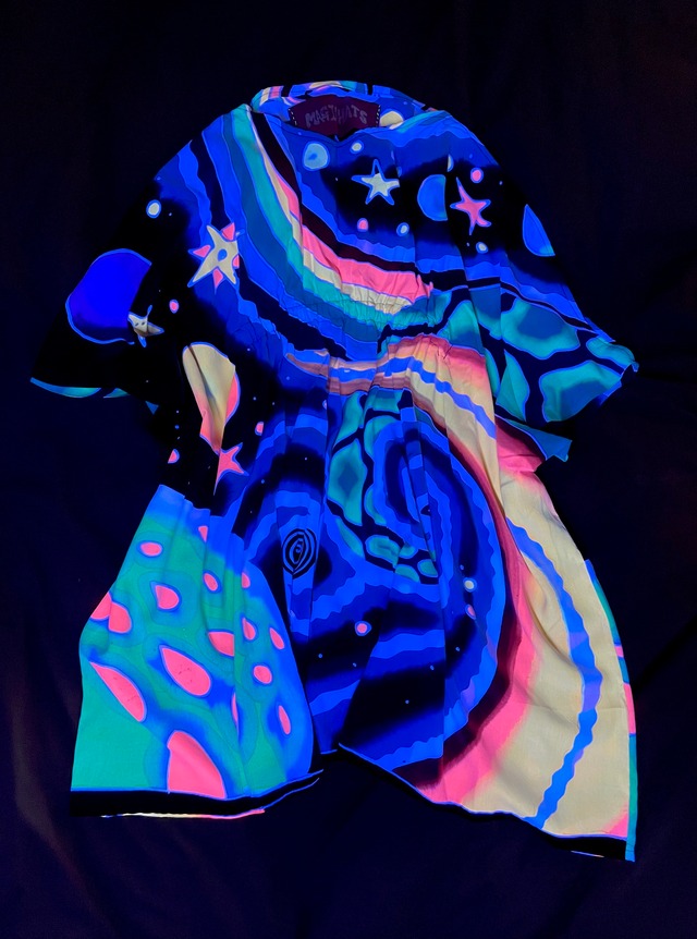 【商品説明】 ろうけつ染めと言う技法で一枚一枚手描きされた大きな柄の布を使用したハンドメイドのポンチョ型チュニックです。 ※生地の段階で擦れやシミがある物を使用しています。背面右肩あたりに破れ跡あり。写真で質感や傷部分をよくお確かめください。 胸下にゴムが通っています。 袖を通すと肩から腕にかけてカットが入っています。振袖の着物のようなシルエットになります。 素材…レーヨン(インドネシア製) サイズ…レディースS〜Lの間でフリーサイズ 肩幅…切り替え無しのためフリー 袖口から袖口までの長さ116㎝ アンダーバスト60㎝〜最大90㎝ 着丈…85㎝ 大胆な絵柄や、蛍光色の色使いが特徴的です。 日中の太陽光のもとでは色鮮やかです。 夜や暗い場所でブラックライトで照らすと、柄が浮かびあがって幻想的な雰囲気です。 フェスやレイヴなどのパーティーで着用すれば目立つこと間違い無しの一点物です。 ※お取り扱いポイント 薄くて乾きやすく、コンパクトに畳める素材です。シワになりやすいので、お洗濯後は物干しに袖を通して干したり、保管時には吊るすと、次回着用時に綺麗な状況で着用できると思います。 アイロン使用可能。 家庭用ミシンを使用して、手縫いの部分もあります。