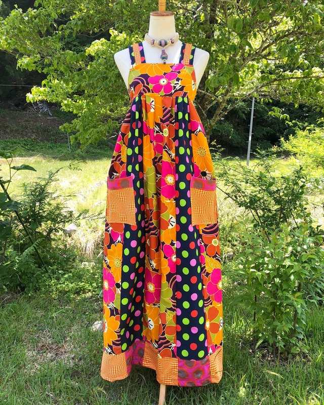【商品説明】 ろうけつ染めと言う技法で一枚一枚手描きされた大きな柄の布を使用したハンドメイドのワンピースです。 生地の製作過程や保管状況などにより、初めから生地にやや汚れが有りました。目立ちにくいですが、写真でお確かめのうえご納得頂ける方のみ、お取引きよろしくお願いします。 素材…レーヨン(インドネシア製) サイズ…レディースM〜Lフリーサイズ 肩幅…切り替え無しのためフリー 身幅… ウエスト… 着丈… 大胆な絵柄や、蛍光色の色使いが特徴的です。 日中の太陽光のもとでは色鮮やかです。 夜や暗い場所でブラックライトで照らすと、柄が浮かびあがって幻想的な雰囲気です。 ウエストに巻いてシルエットをアレンジできるリボンベルト付きです。 70年代ヒッピーや、魔法使いのようなシルエットに、サイケデリックな模様の全身総柄、 フェスやレイヴなどのパーティーで着用すれば存在感抜群です。 ※お取り扱いポイント 薄くて乾きやすく、コンパクトに畳める素材です。シワになりやすいので、お洗濯後は物干しに袖を通して干したり、保管時には吊るすと、次回着用時に綺麗な状況で着用できると思います。 アイロン使用可能。 家庭用ミシンを使用して、手縫いの部分もあります。