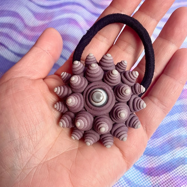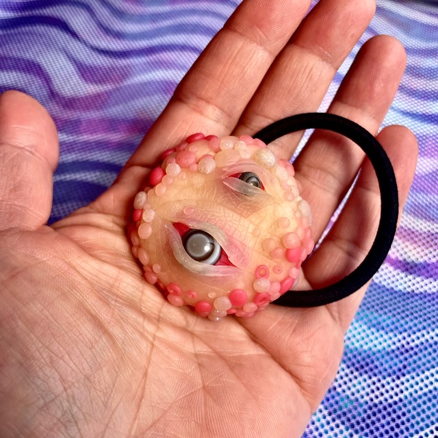 【商品説明】 ヘアゴム 素材…premo (pvc/塩化ビニール、顔料)/天然石 サイズ…縦5㎝×横5㎝ 厚み1.5㎝くらい ひとつひとつ指で捏ねて製作しています。 よ〜く見ると…作家の指紋が残る、ハンドメイドをリアルに感じる作品兼アクセサリーです。 真ん中の目玉部分には天然石の天眼石(瑪瑙)を使用しています。天眼石には魔除け効果があると言われています。 ブラックライトに反応して光って見えます☆ ヘアアクセサリーとして使用したり、 手首に着けたり、バッグの持ち手やリュックの肩紐に取り付けても可愛く、 ユニセックスで使用可能です。 どこでも一緒にお出掛けするほど、どんどん愛着の湧くアクセサリーです♡ 購入されたお客様からは「付けてると二度見される」「それ何?!と声を掛けられる」「御守りになってる」…と高評を頂いています☆ ※こちらの商品は在庫が2つ、それぞれ目玉部分の石の模様が若干違います。どちらが届くかはお選び出来ません。ご了承ください。 ※ 耐水性のある素材です、水や入浴可能な温度のお湯でしたら問題無く使用して頂けます。 アルコールには浸けないでください。 サウナなどの高温になる場所では外して下さい。 衝撃や圧力は破損の原因になります。