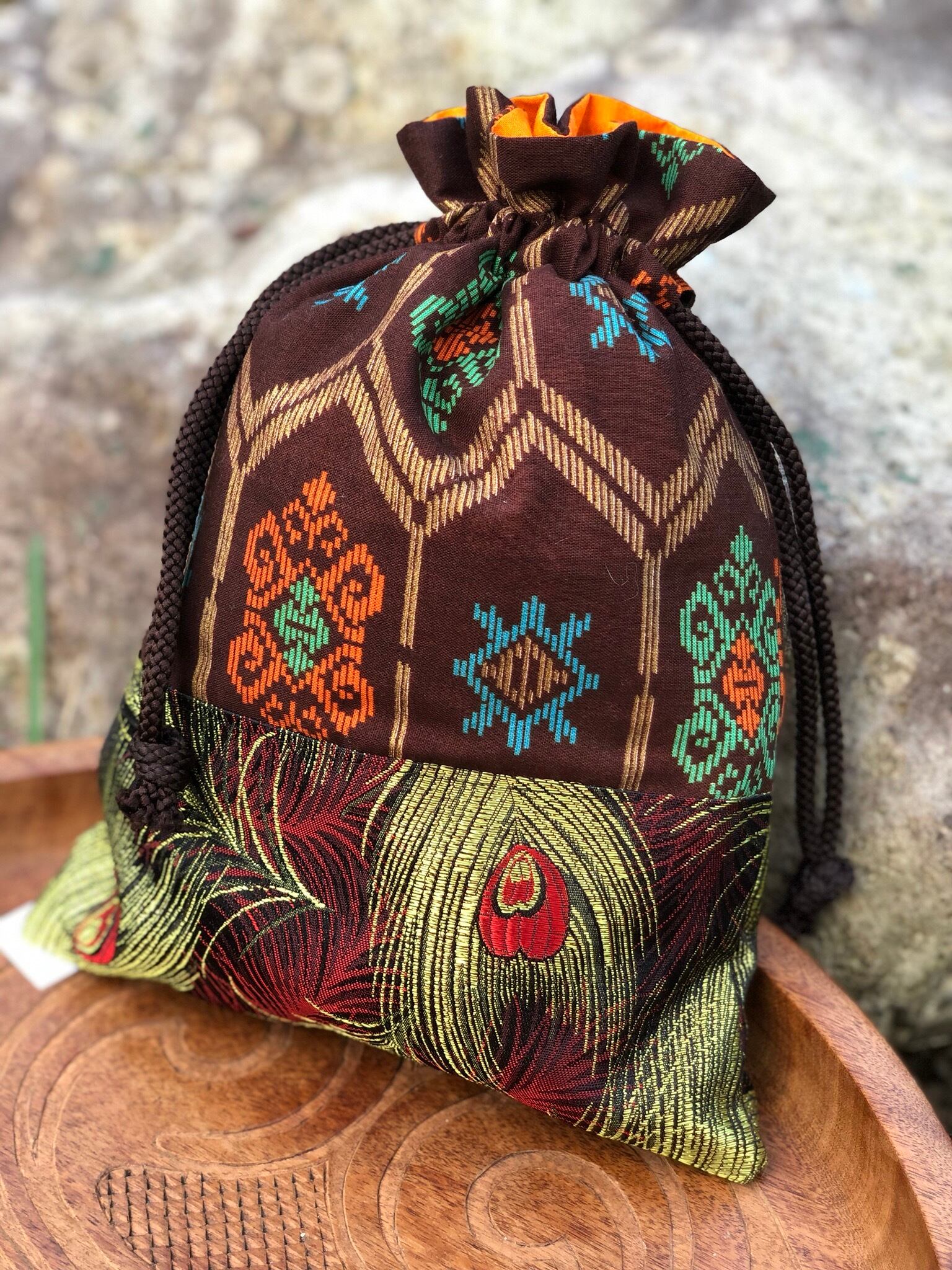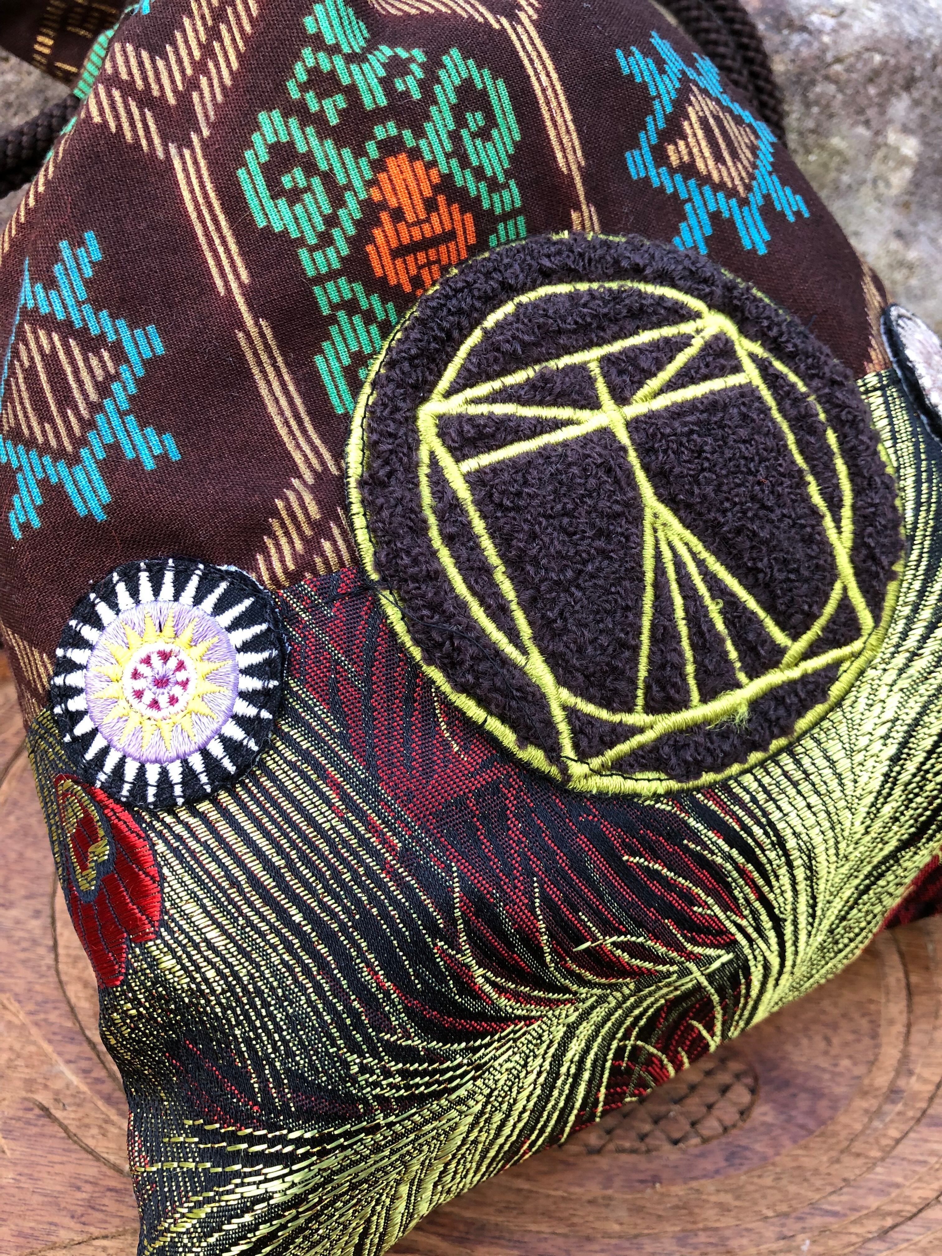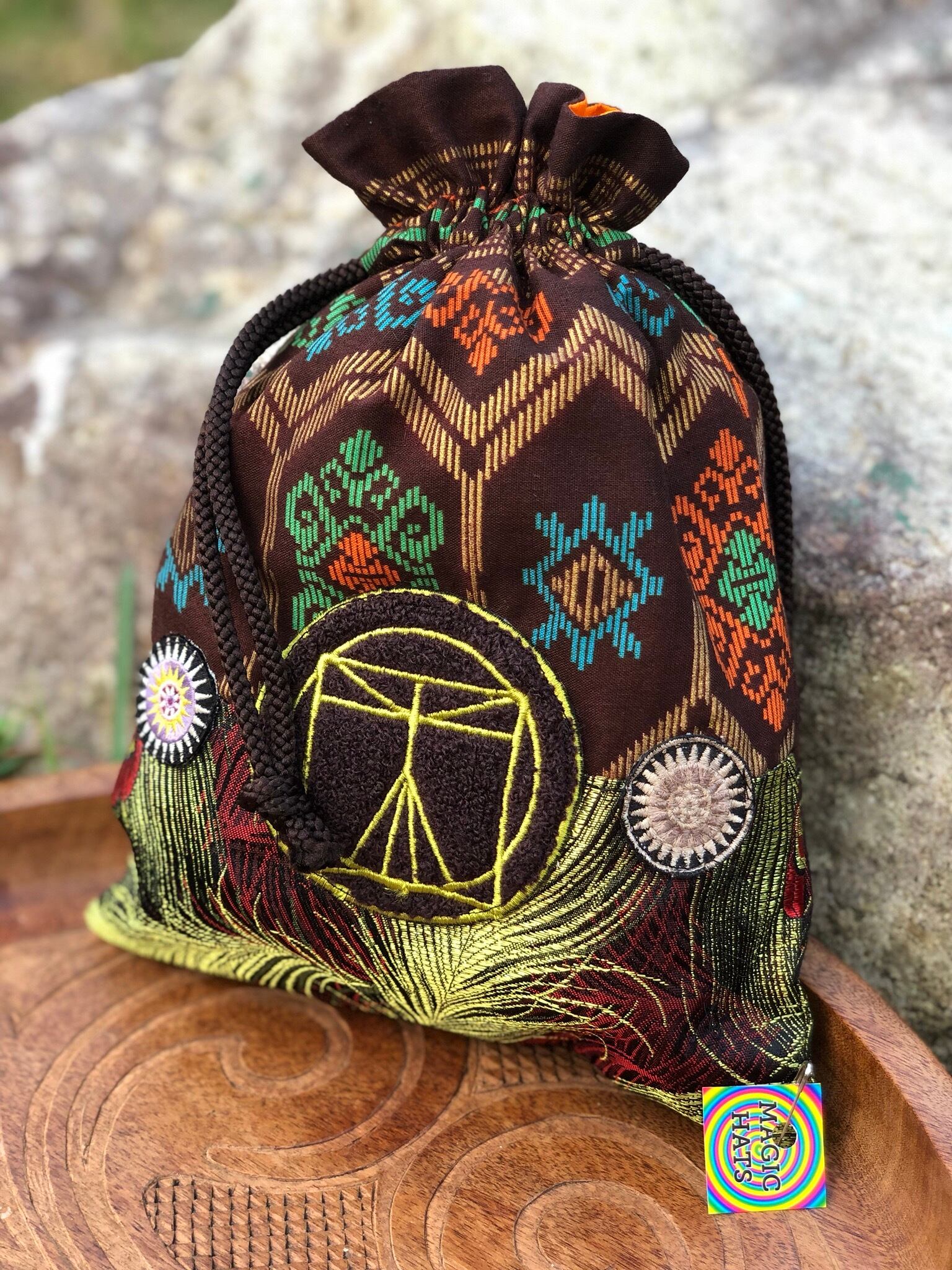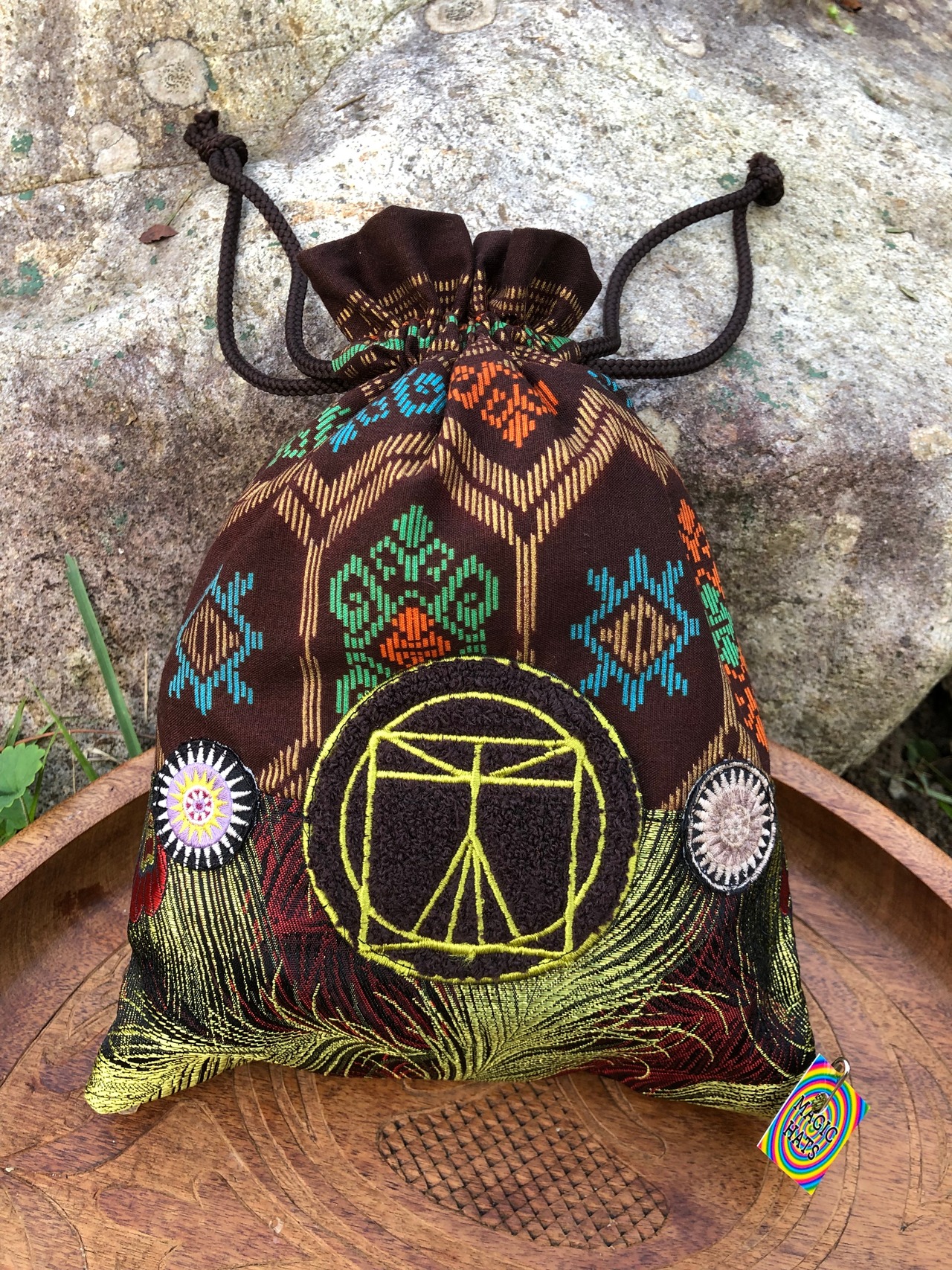 レオナルドダヴィンチの人体図柄ワッペン、#トライバル な柄の生地、孔雀の羽根柄の生地など、色々な生地を組み合わせて作った巾着ポーチです。
