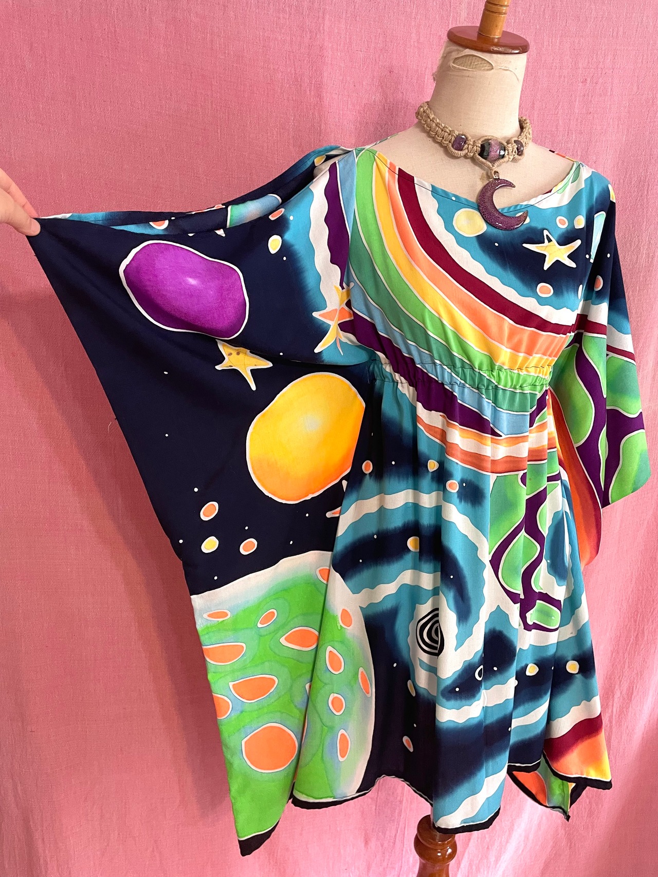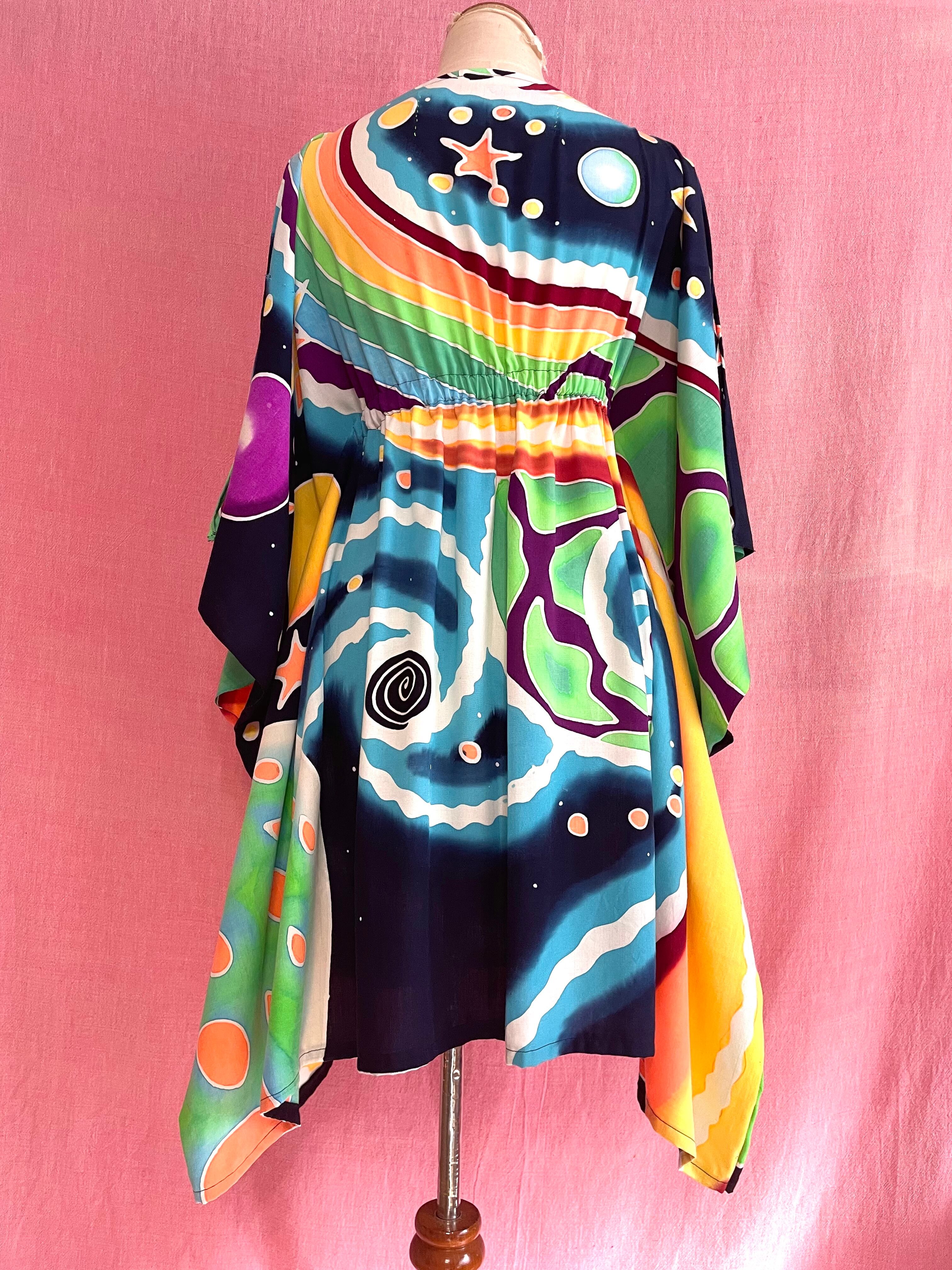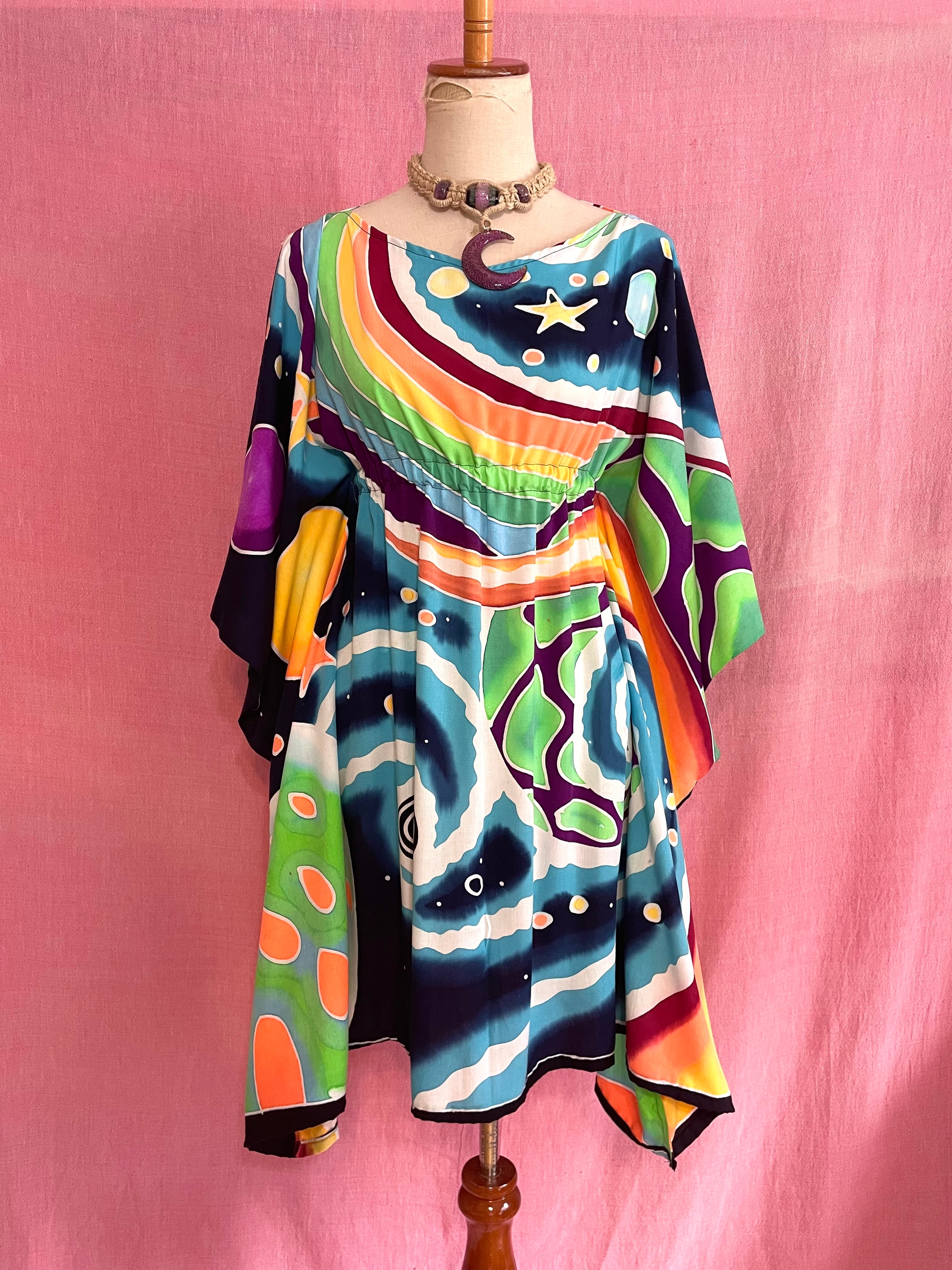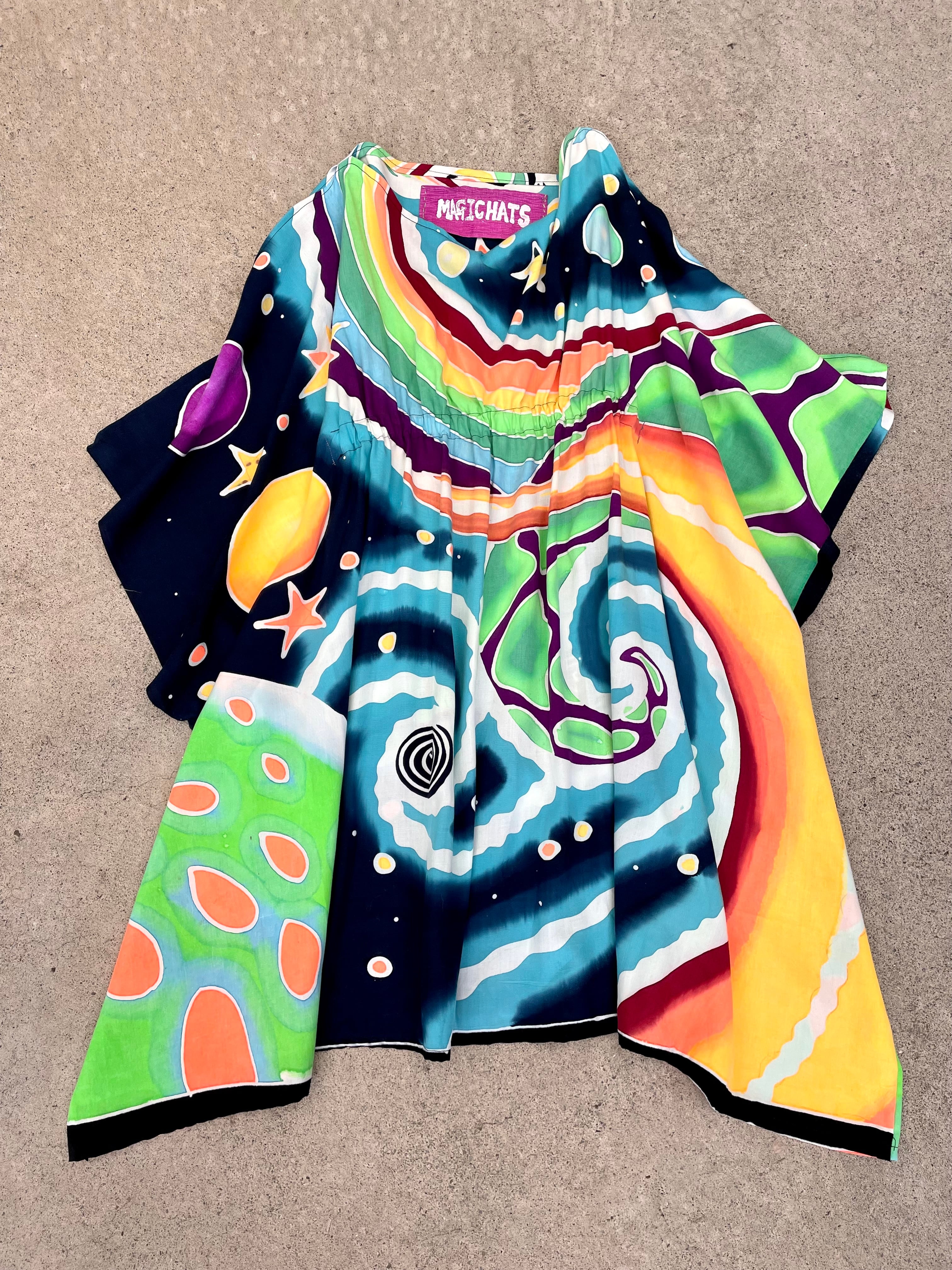 ろうけつ染めと言う技法で一枚一枚手描きされた大きな柄の布を使用したハンドメイドのポンチョ型チュニックです。