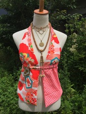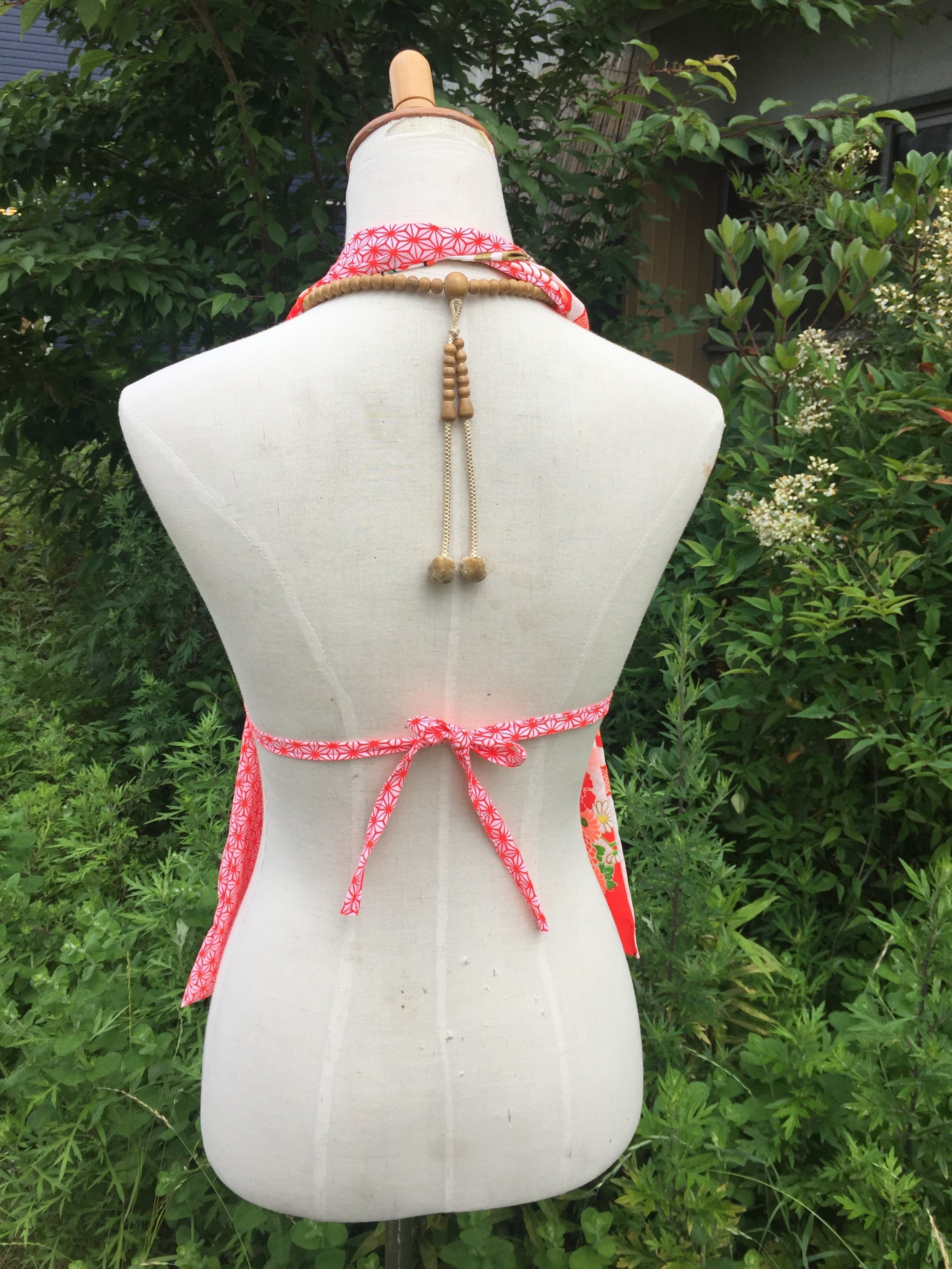 ホルターネックタイプで、背中の紐も結んで着用します。アンダーバストのあたりにも紐が通っているので クシュクシュっとたくして体型に合わせみて下さい。